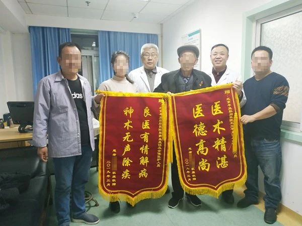 林老先生手术顺利,经过半个多月的恢复,分泌物越来越少,炎性反应也越来越少,已经可以正常饮食、排便。20日下午,老人的女婿,外孙女,女婿外甥为了感谢张燕生主任、王立平主任治好了老人的顽疾,送来了两面鲜红的锦旗。