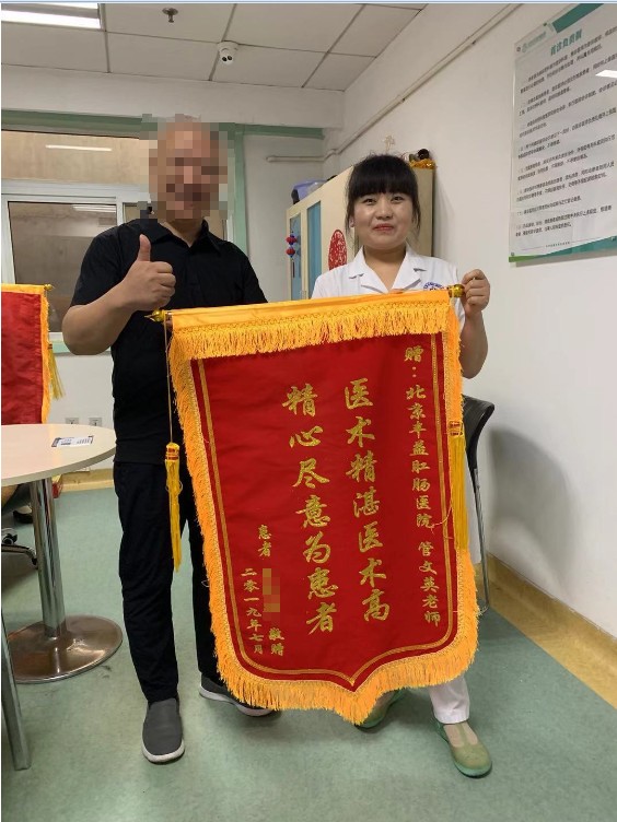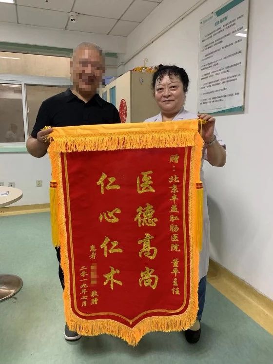 2019年8月1日,恢复健康的李先生带着两面锦旗来到北京丰益肛肠医院门诊董红主任的诊室,一面绣有“医德高尚仁心仁术”,赠予董红主任,一面绣有“医术精湛医术高 精心尽意为患者”赠予医务人员管文英。看到锦旗上绣的字样,李先生有些抱歉的说:“不好意思,名字印错了,不过董红主任的医术我搞不错。这次看病一点都没有操心,反倒像是给我自己放假了,度假时间结束了,我这病也看好了。”