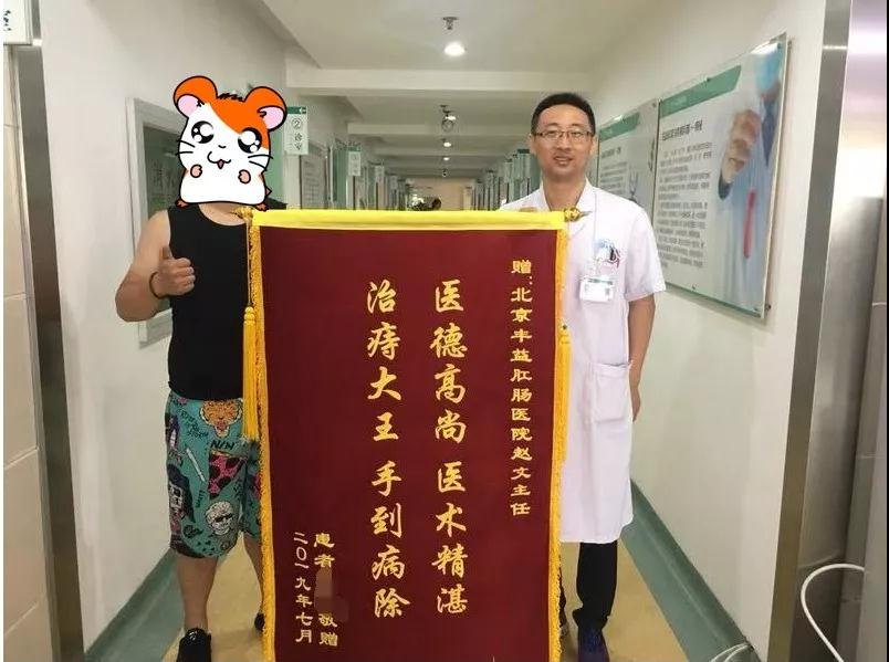 恢复健康的李先生,看到肛门完好无损,包块没了,也不疼了,接受治疗到康复才一个月的时间,这简直神了。怀着感激的心情,李先生将印有“医德高尚 艺术精湛 治痔大王 手到病除”鲜红的锦旗赠送给了赵文医生。李先生称赞:北京丰益肛肠医院的赵文医生在我心里就是治痔大王,太棒了!太感谢了,没怎么耽误工作,也不怎么疼,真的是量身定制一样。