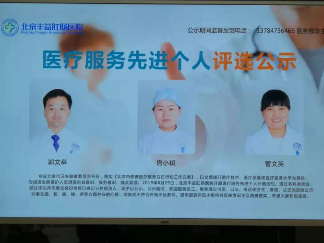 为认真落实《北京市改善医疗服务规范服务行为 2019 年行动计划》,北京丰益肛肠医院制定了《改善医疗服务百日行动工作方案》,方案强调:我们医护人员要加强自我管理,树立危机感和紧迫感,不断提高专业基础理论和专业技能操作水平,真正为患者提供高质量的医疗服务。北京丰益肛肠医院举办了医疗服务先进个人评选活动。